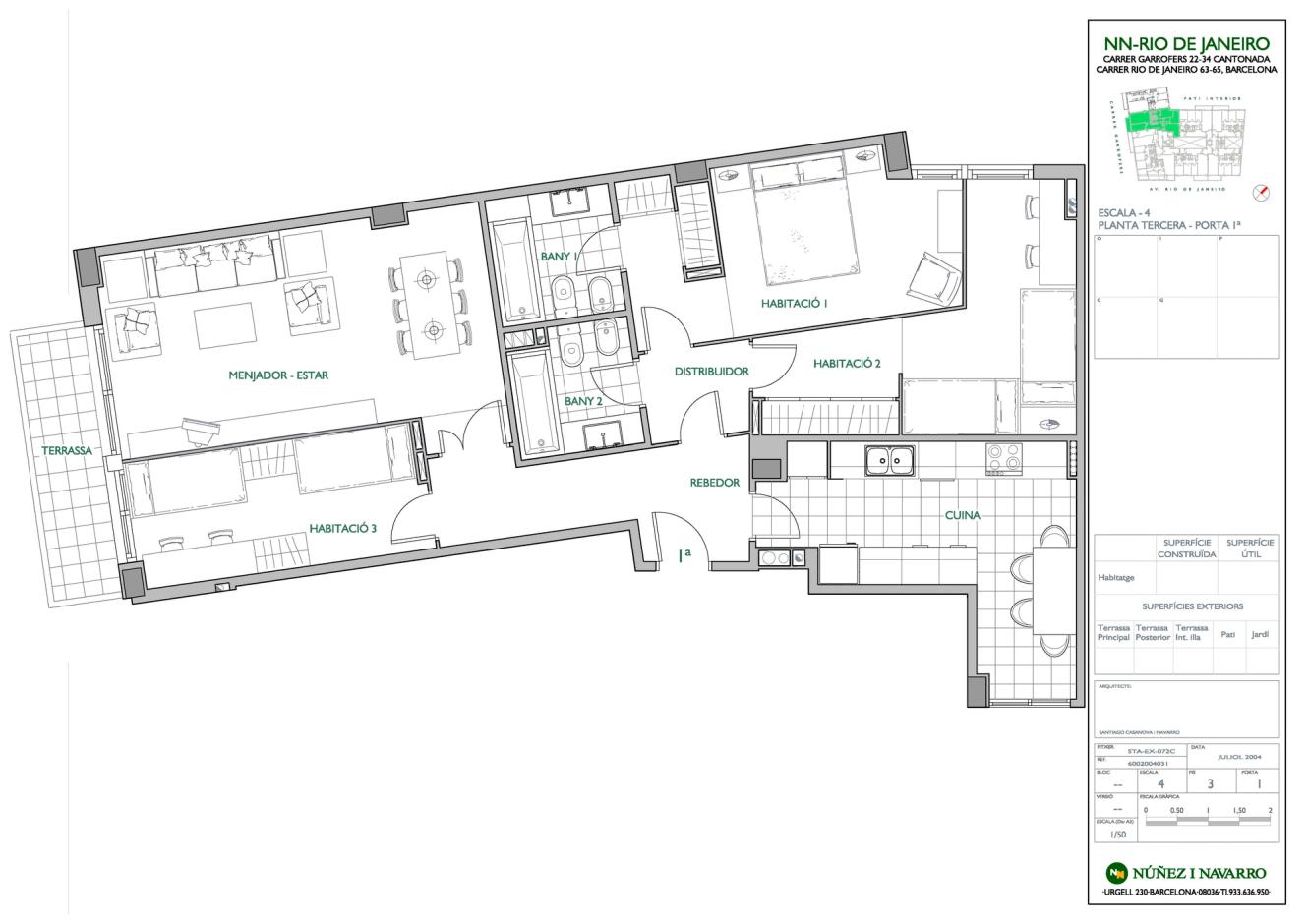 El pis disponible te un programa funcional de: saló-menjador, tres dormitoris, un d'ells doble en suite amb bany complet, un altre bany i cuina office.