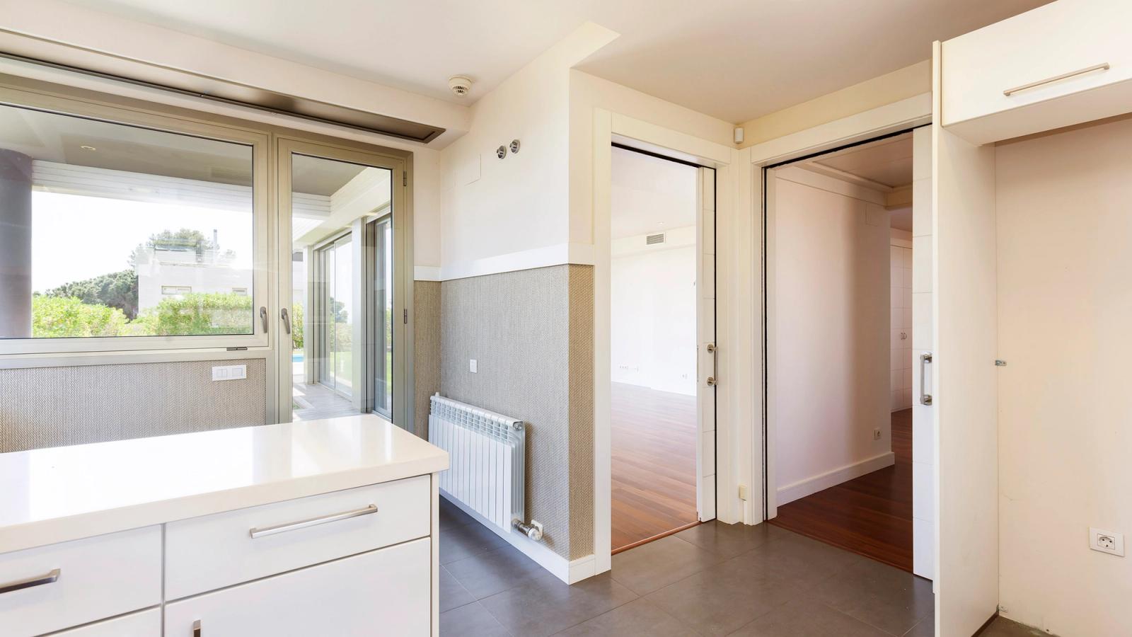 Attractively designed kitchen/diner, equipped with oven, microwave and extractor hood. Parquet flooring, gas heating with radiators, built-in wardrobes, aluminium frames and electrically-controlled shutters, with the latest in home automation systems.