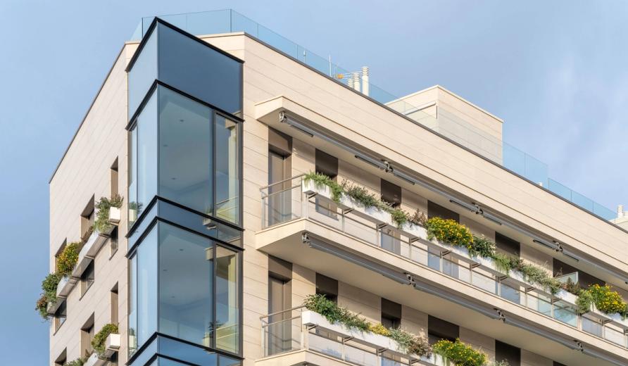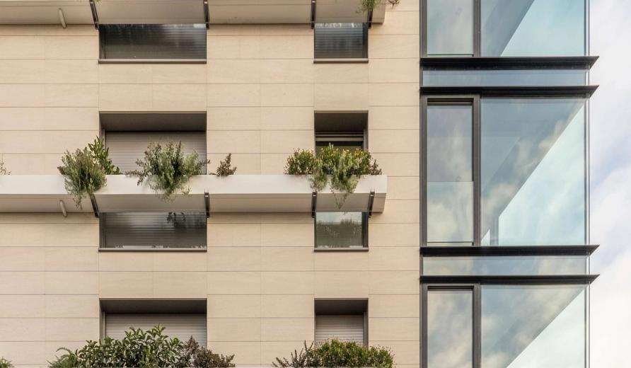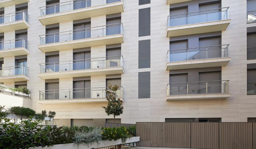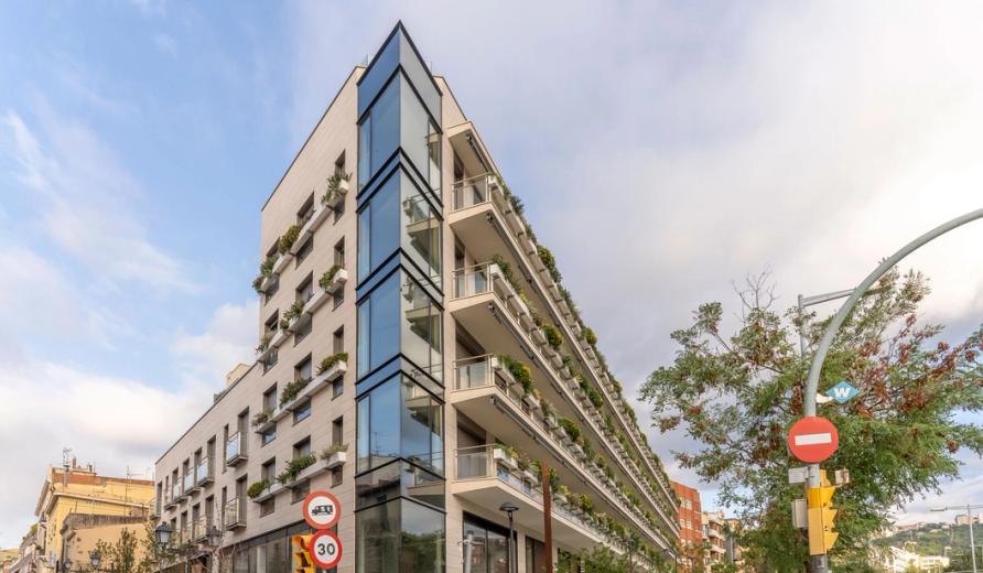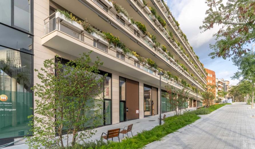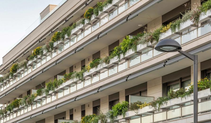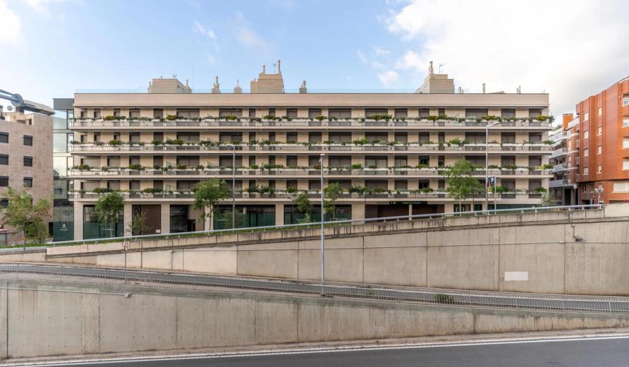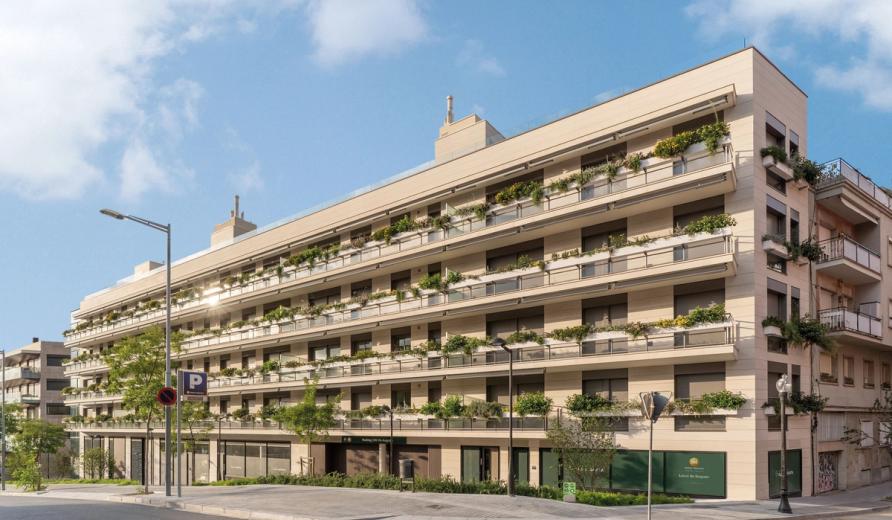Eco-efficient residential complex with one available apartment featuring 2 bedrooms and 2 bathrooms. Exterior, with a landscaped balcony and plenty of natural light.