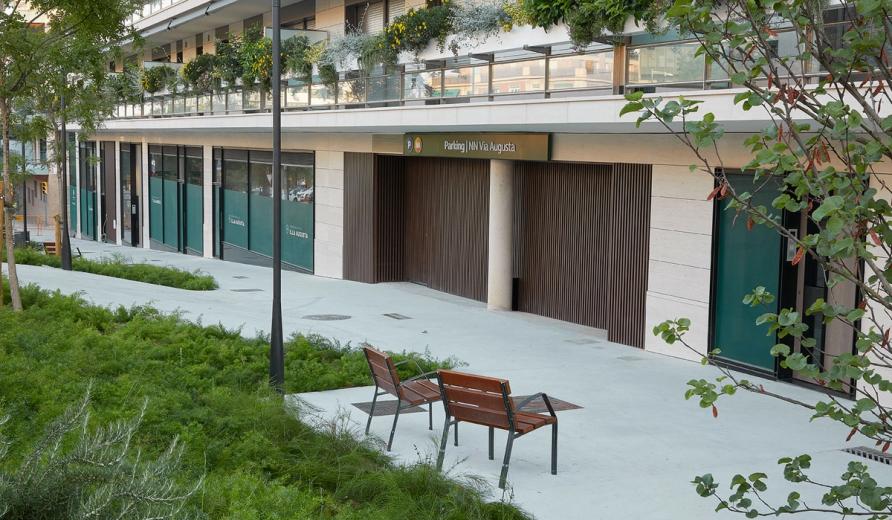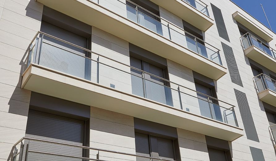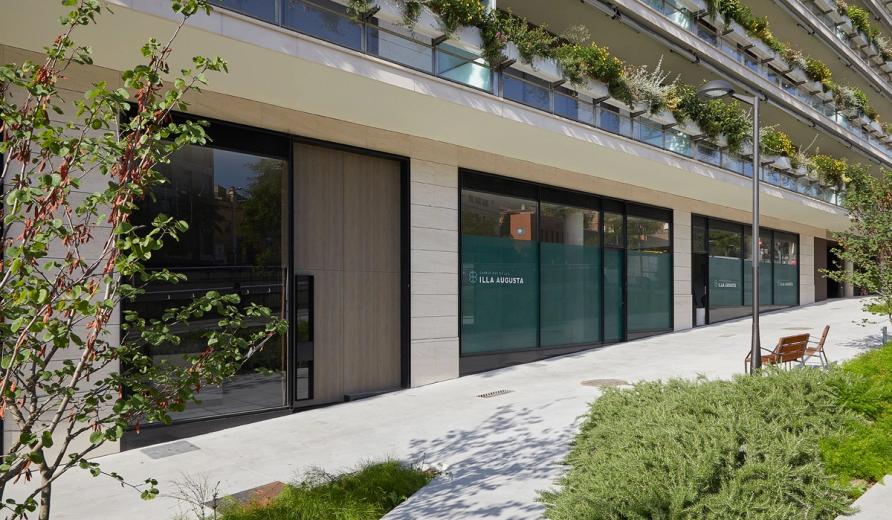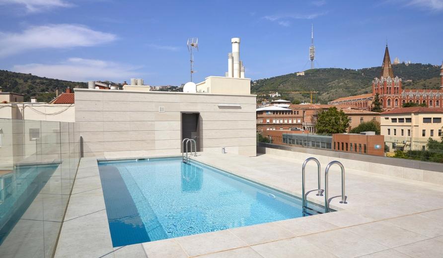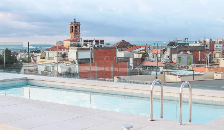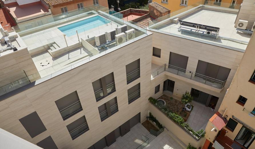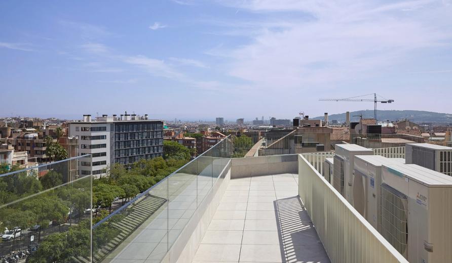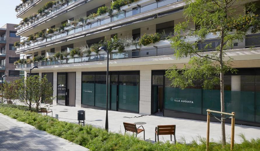 Eco-efficient residential complex with one available apartment featuring 2 bedrooms and 2 bathrooms. Exterior, with a landscaped balcony and plenty of natural light.