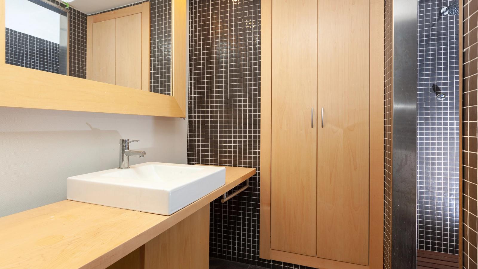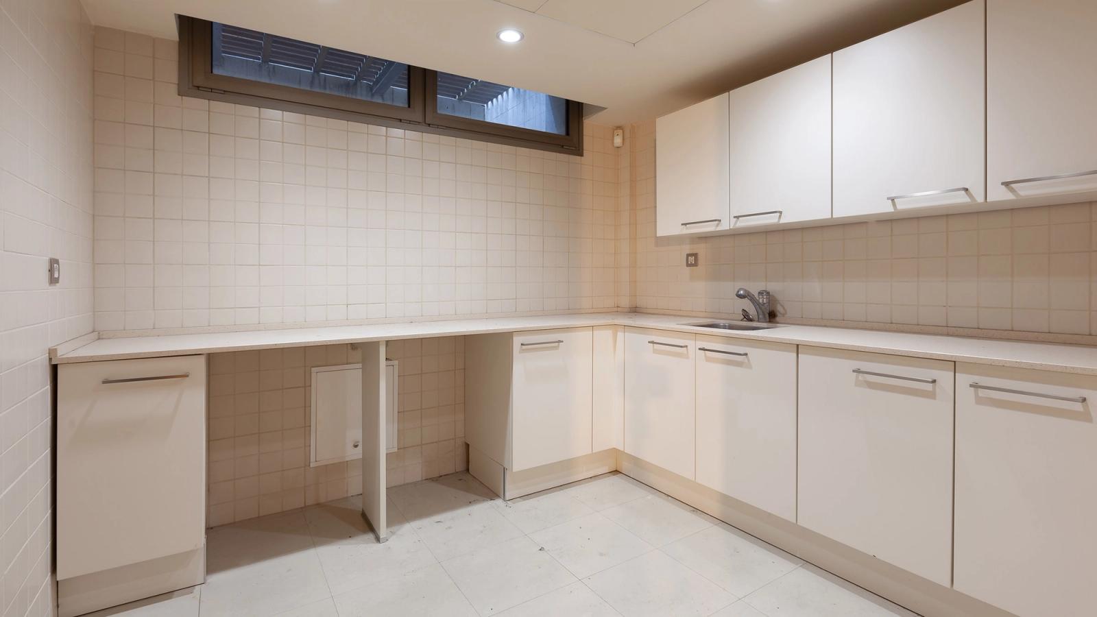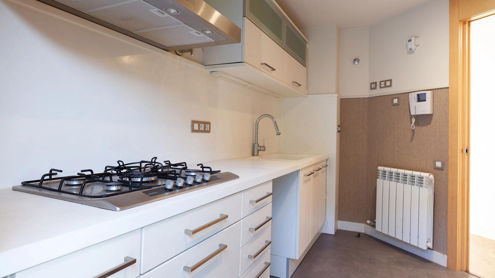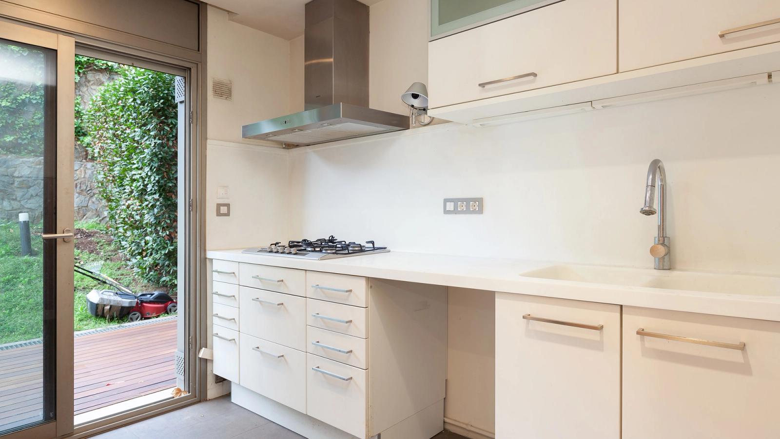 La cocina office de gas, equipada con horno, microondas y campana extractora, tiene salida directa a terraza.