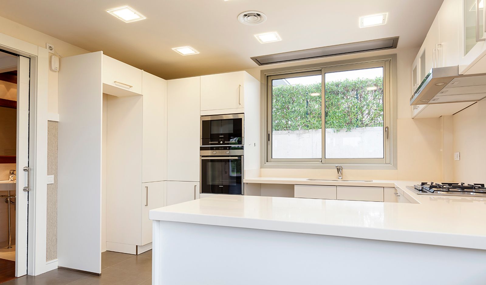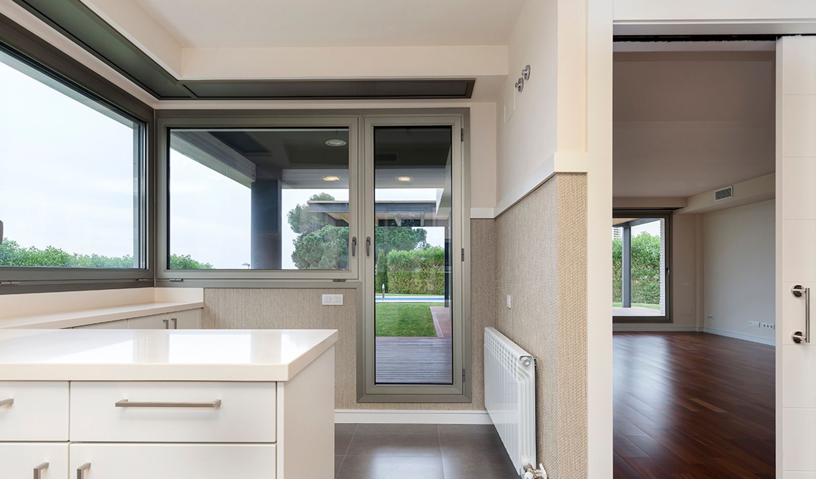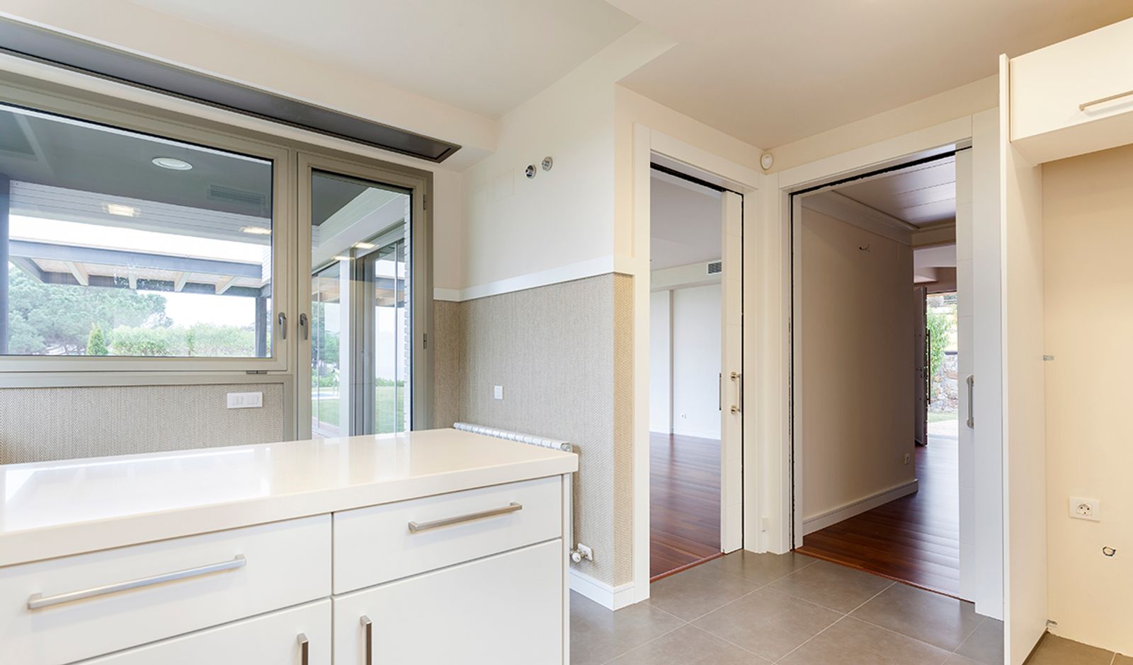 Cocina office equipada con horno, microondas y campana extractora. Suelos de parqué, calefacción de gas por radiadores, armarios empotrados, cerramientos de aluminio y persianas eléctricas, a la última en domótica del hogar.